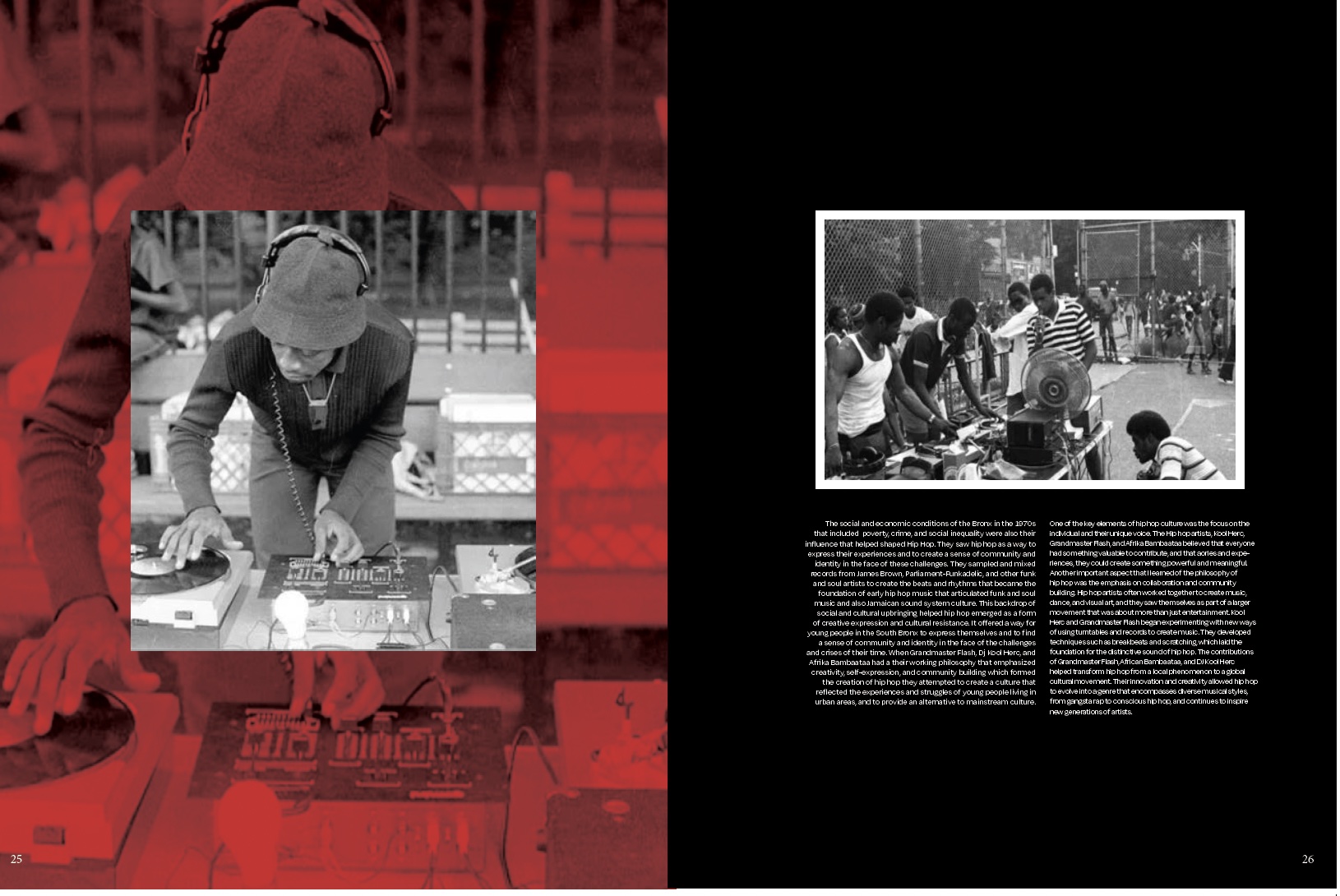 Last but not least The next phase of my project involves beginning the visual drafting of my book. This step includes designing out the layout on InDesign with design elements that will visually complement the research and content. I focus on establishing a consistent visual identity that reflects the essence of hip-hop culture—bold, dynamic, and creative. This included my researching selecting of color palettes, typography, and creating preliminary designs for page my layouts, including text placement, image integration, and visual hierarchy. By combining these visual elements, I aimed to create a cohesive and engaging design that enhances the storytelling experience and brings the cultural richness of hip-hop to life.