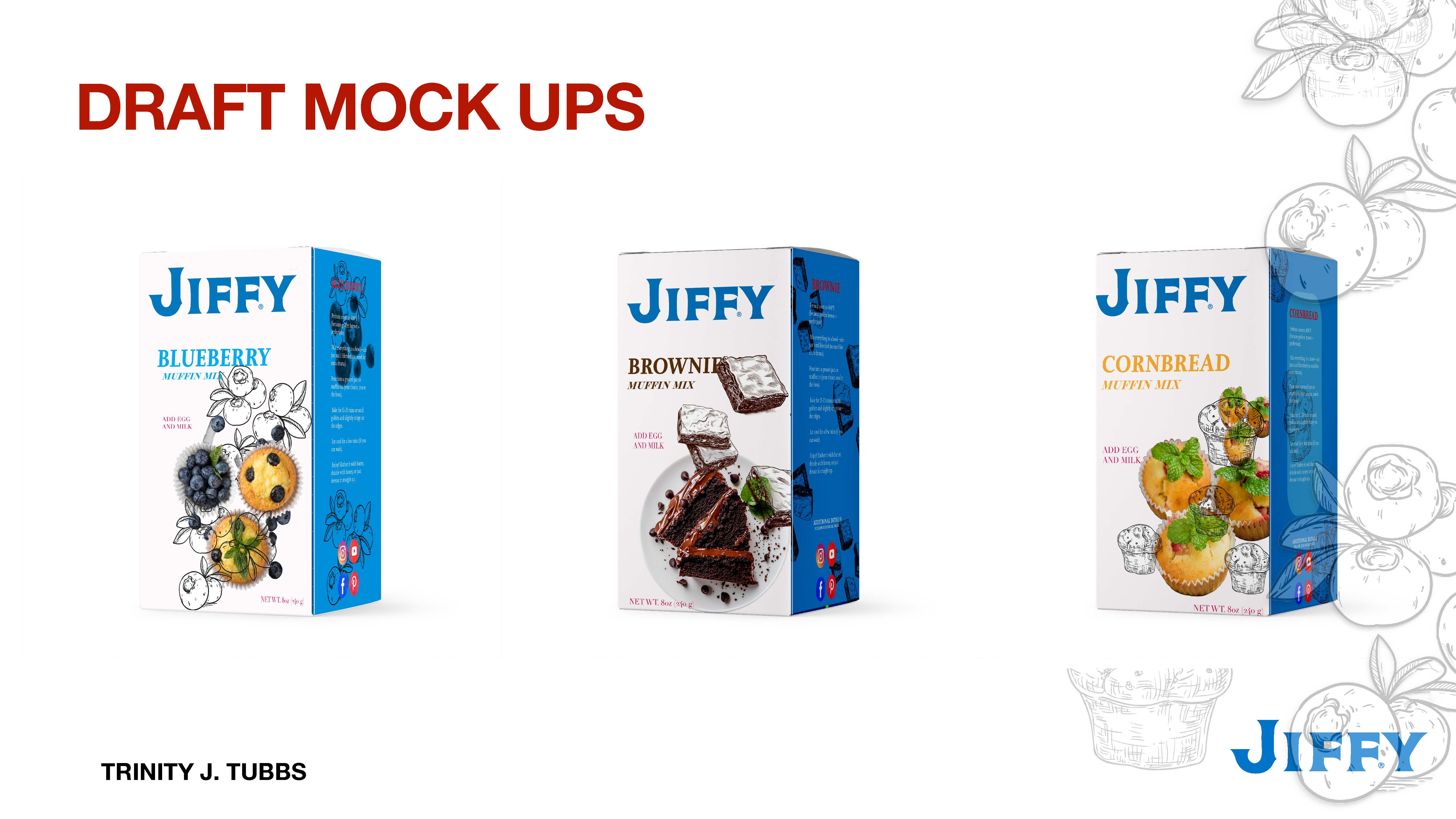 Last but not least as i pick my final look I go by applying the updated design to 3D renderings and physical prototypes, the iterations were tested for shelf impact, brand consistency, and consumer appeal. These mockups explore how the fusion of illustrative and photographic elements enhances the packaging’s storytelling, ensuring the balance of nostalgia and modernity translates effectively across various retail settings. Through refinement based on visual hierarchy, legibility, and market positioning, the final mockups present a cohesive, strategic redesign that strengthens Jiffy’s legacy while expanding its reach.